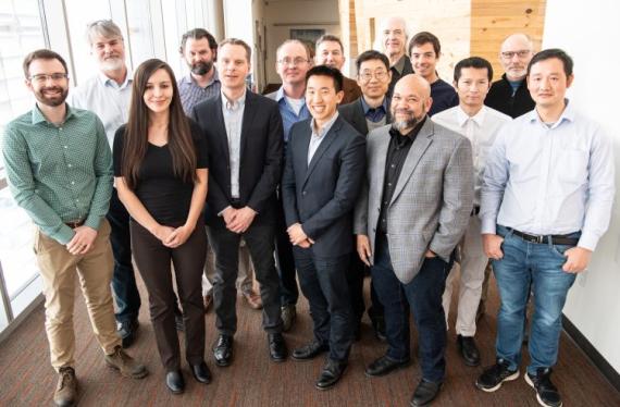 Dr. Daniel Kroupa (Postdoctoral Scholar with Daniel Gamelin; Chief Technical Officer, BlueDot Photonics) and Professor David Ginger (Chief Scientist, UW Clean Energy Institute) [US-MAP Consortium photo, far left and fifth from left, respectively].